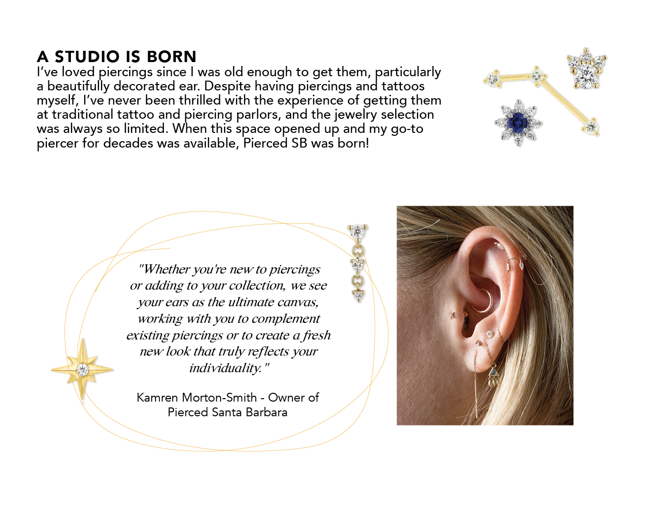 This growing self-expression trend is gaining popularity and inspiring endless new personalized piercing configurations. The studio’s dazzling 14k yellow, rose, and white gold body jewelry collections with both precious and manmade gemstones tend to motivate multiple piercings! Studio manager and senior piercer Erin Vogt and junior piercer, Camille Harris, are available for consultations to help clients plan piercings compatible with their unique anatomy. If a particular piercing is not a good fit, they'll suggest other more suitable options. Here, owner Kamren Morton-Smith talks about the motivation behind her business, the studio's offerings, the fun to be had there and a few reasons to consider getting pierced.